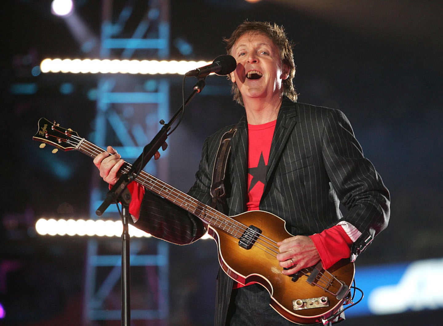 The XXXIX Superbowl Half-Time Show JACKSONVILLE, FL - FEBRUARY 06: Musician Paul McCartney performs on stage during the XXXIX Superbowl Half-Time show at Alltel Stadium on February 6, 2005 in Jacksonville, Florida. (Photo by Frank Micelotta/Getty Images) (Frank Micelotta/Getty Images)