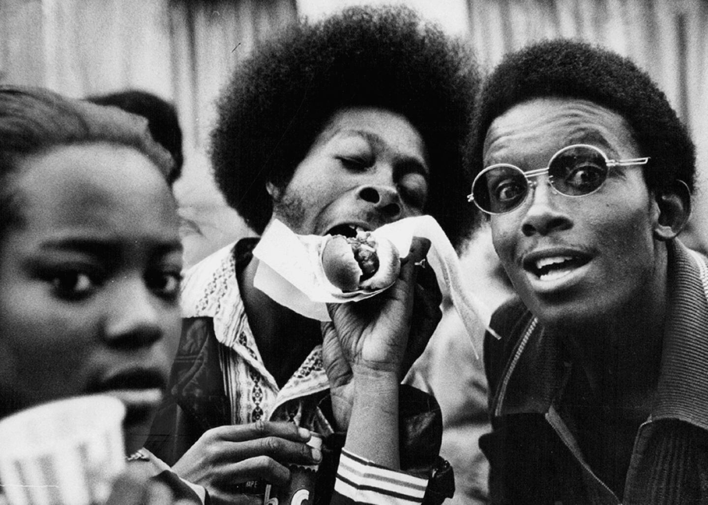 Traditional Juneteenth spreads include barbecue, soul food, and anything red. The color red represents the blood of Black people who were enslaved and never experienced freedom, as well as the resilience and transformational power of Black people. Here, several celebrants enjoy hot dogs and sodas.