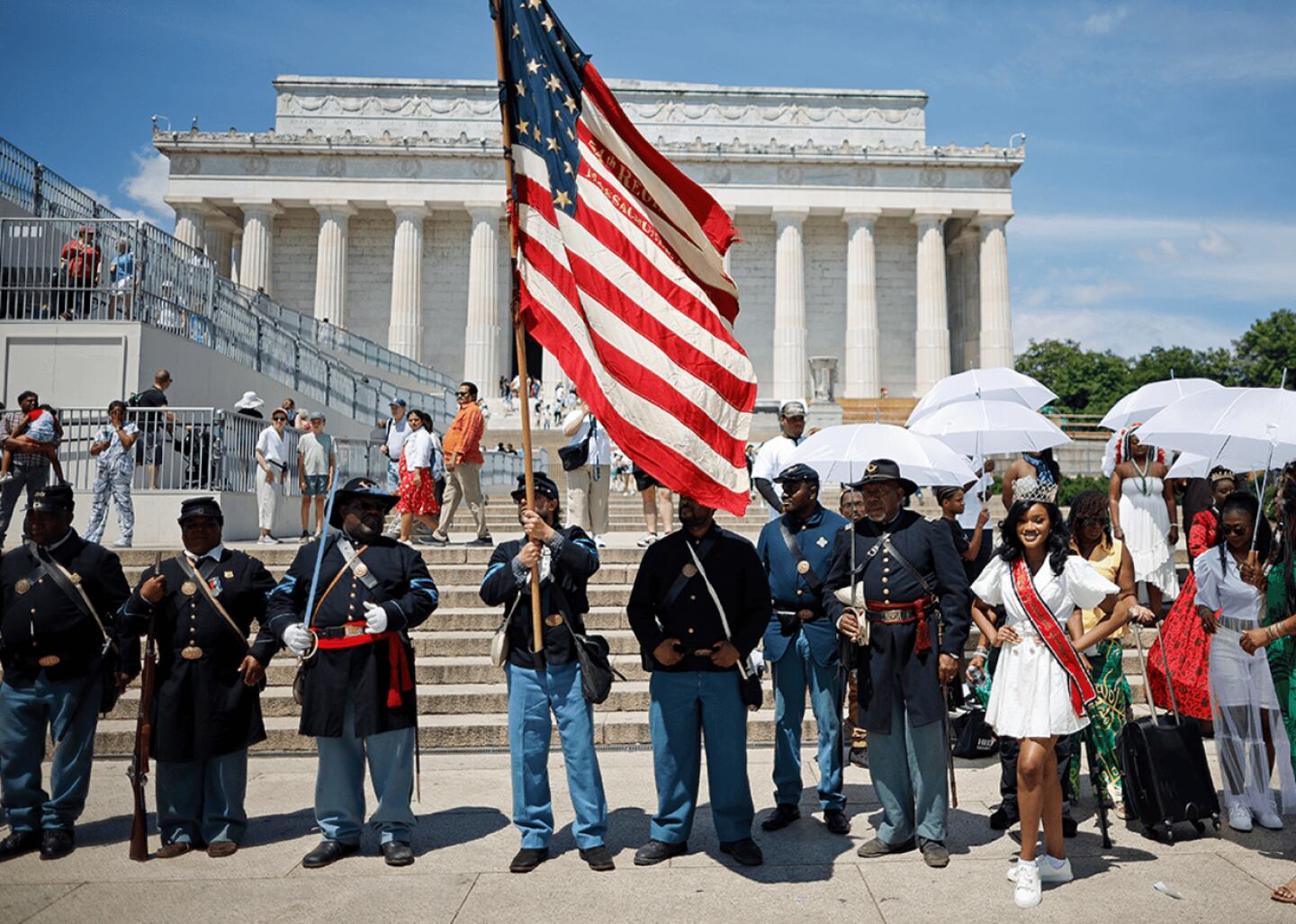 Representatives from the U.S Colored Troops and Buffalo Soldiers, a Maryland organization made up of historians and re-enactors, gather at the Lincoln Memorial to celebrate Juneteenth 2024. In 1866, the Army Reorganization Act created room for permanent Black regiments for the first time. A mix of Civil War veterans, freedmen, and formerly enslaved Black men, these cavalrymen were nicknamed "Buffalo Soldiers" by Indigenous people, both for their appearance and fighting skills.