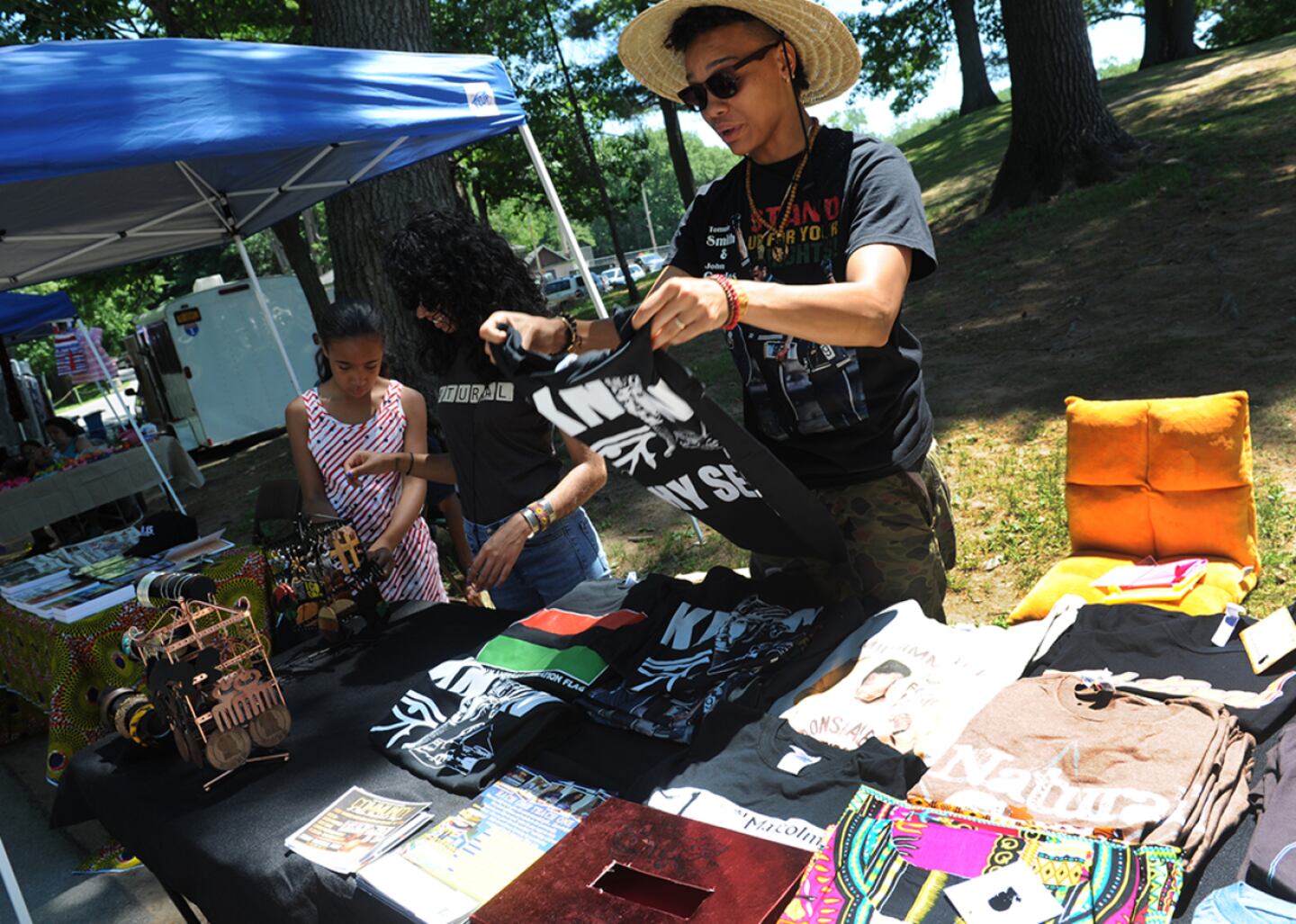 At a Juneteenth celebration in Schenectady, New York's Central Park, a woman sells t-shirts as part of a local fundraiser. Vendors selling merchandise are a common sight at Juneteenth events. As in this case, proceeds sometimes go toward community causes.
