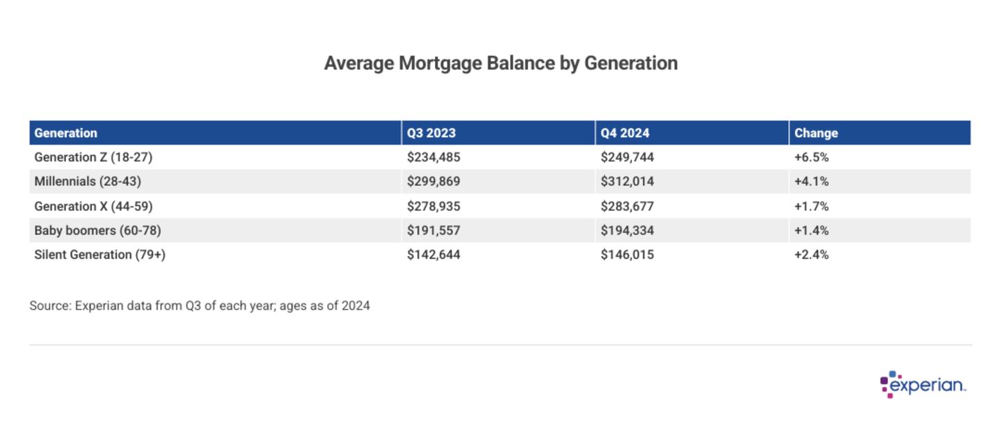 According to Experian data, younger homeowners have larger mortgage balances on average than older mortgage borrowers. That's only logical given higher home prices and the fact that younger homeowners are more likely to have recently begun their decades-long journey of paying back a home loan.