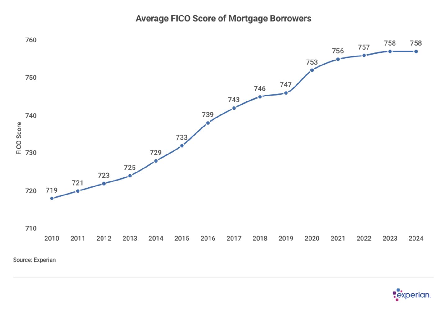 The average FICO® Score for those with a mortgage was 758 in 2024, the same as in 2023. Like FICO® Scores more broadly, credit profiles of mortgage borrowers have steadily improved over the past 15 years.
