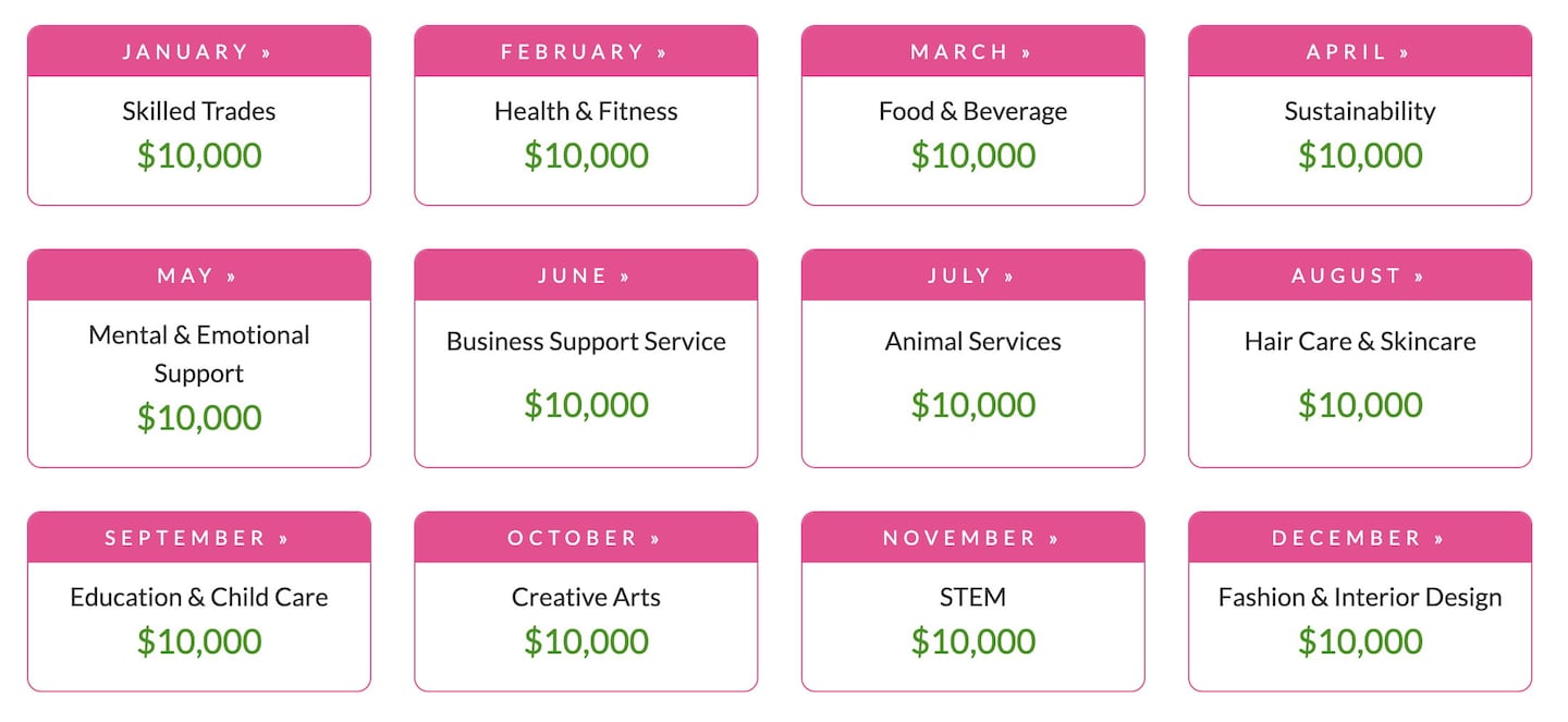 For the Business-Specific Grant, there are 12 business categories you could be eligible for. If your business falls under these specific business categories, you automatically become eligible (once per year). Each year, one of these 12 winning business categories is given an additional grant of $25,000.