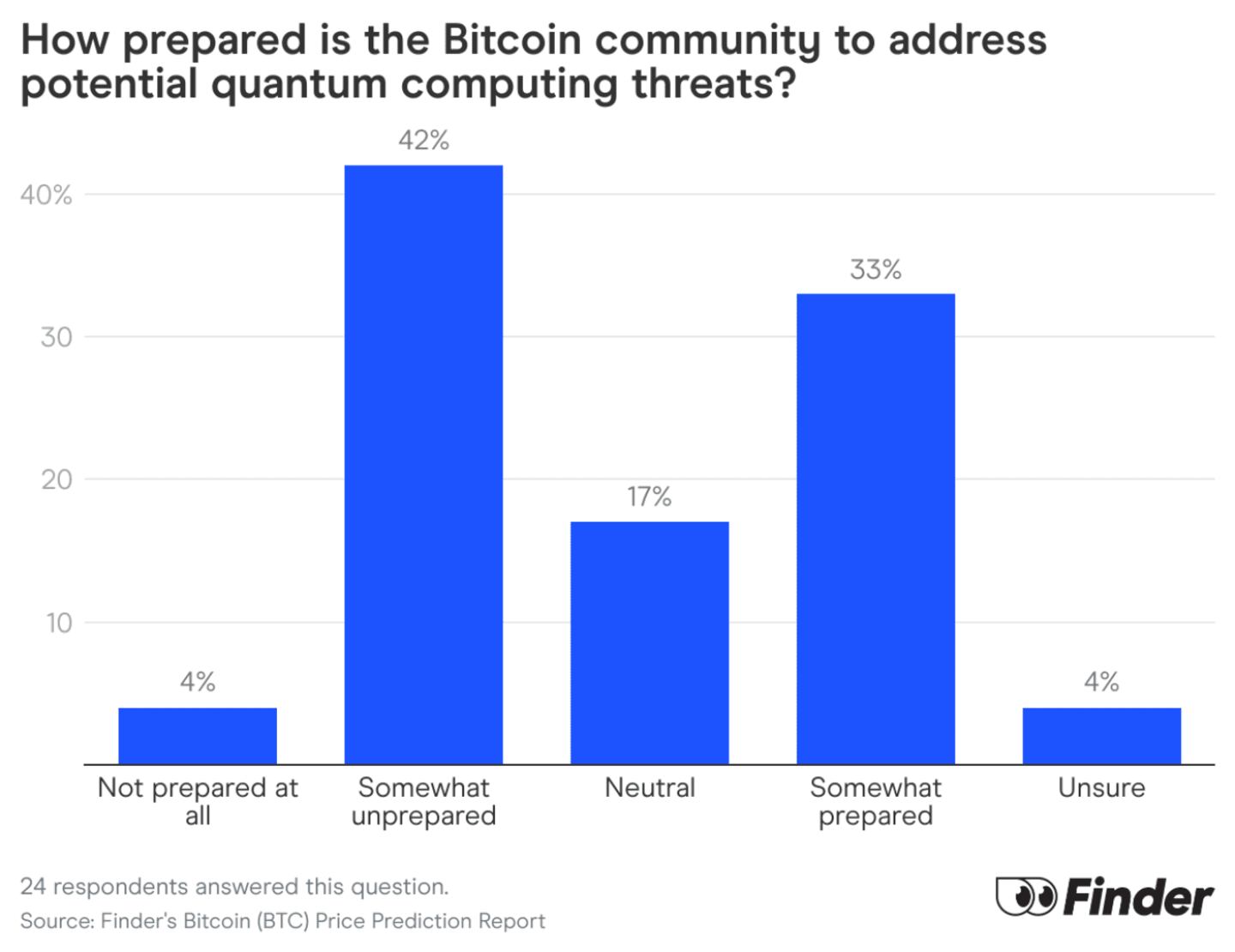 Close to half of the panel (46%) say that the bitcoin community is not well equipped for the threats quantum computing poses to BTC, with 42% saying that the community is somewhat underprepared and 4% saying they’re not prepared at all.