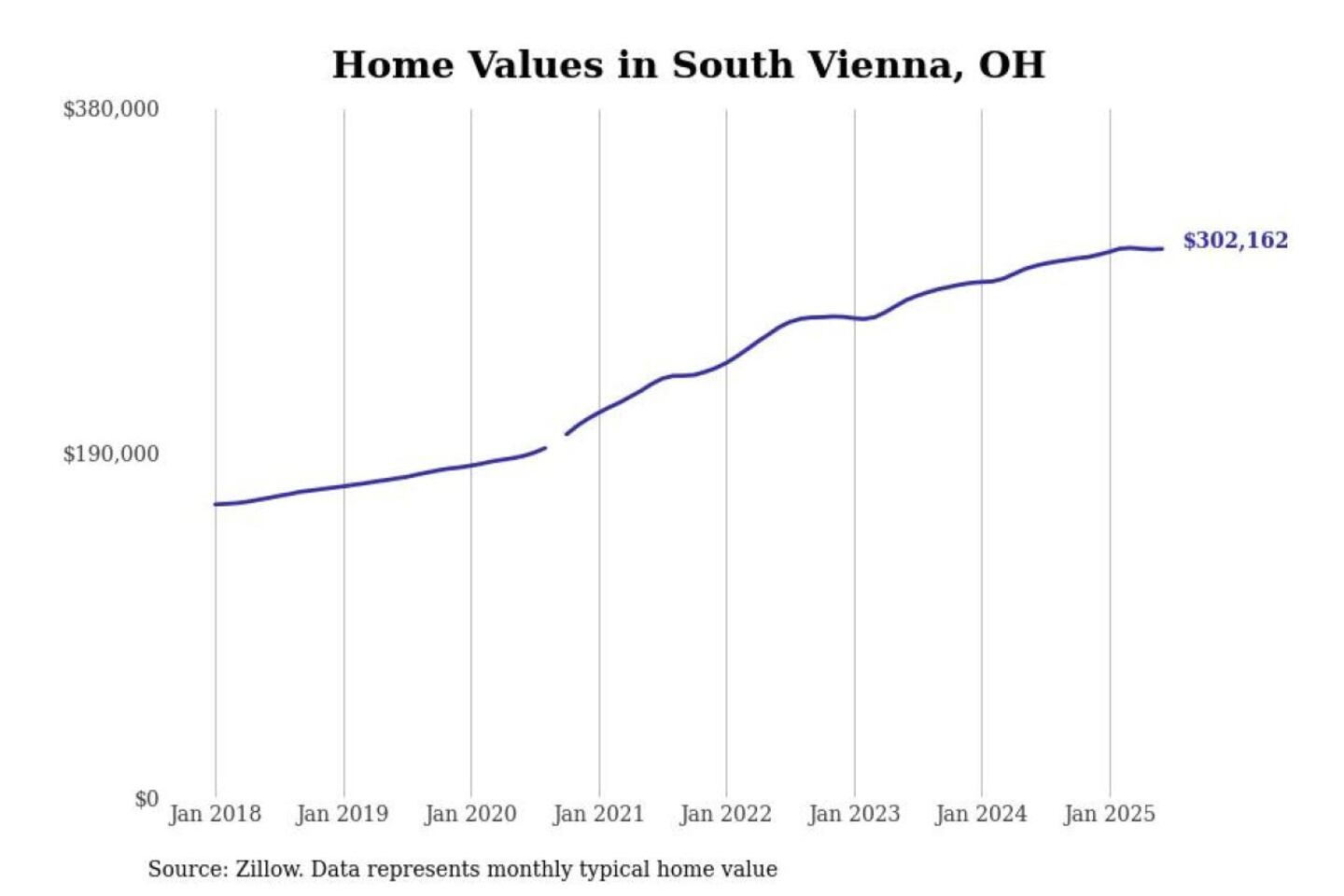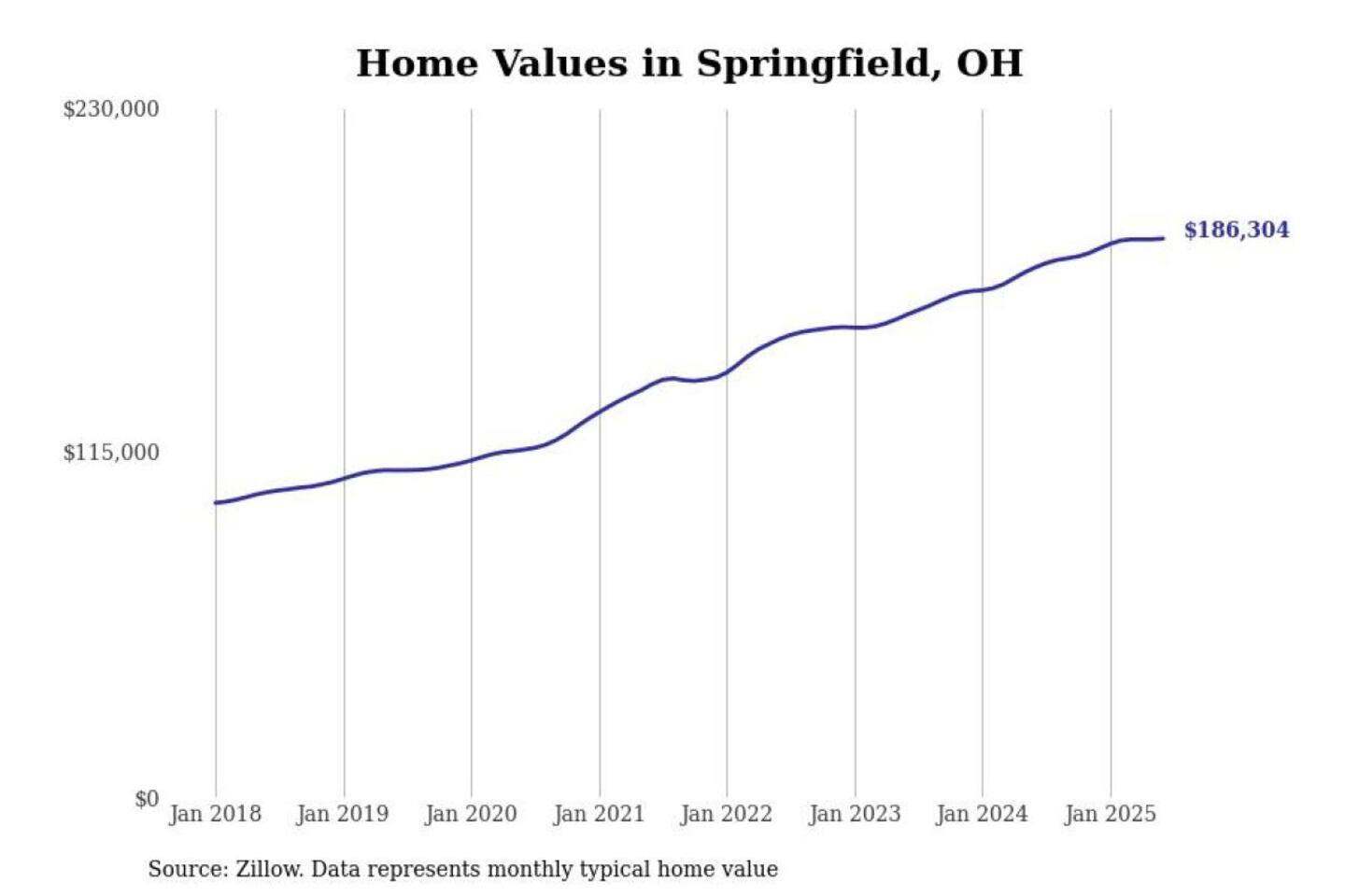 Stacker compiled a list of cities with the most expensive homes in the Springfield, Ohio metro area using data from Zillow. Charts show the monthly typical home value since January 2018. All 8 cities and towns with data available were included in the list.