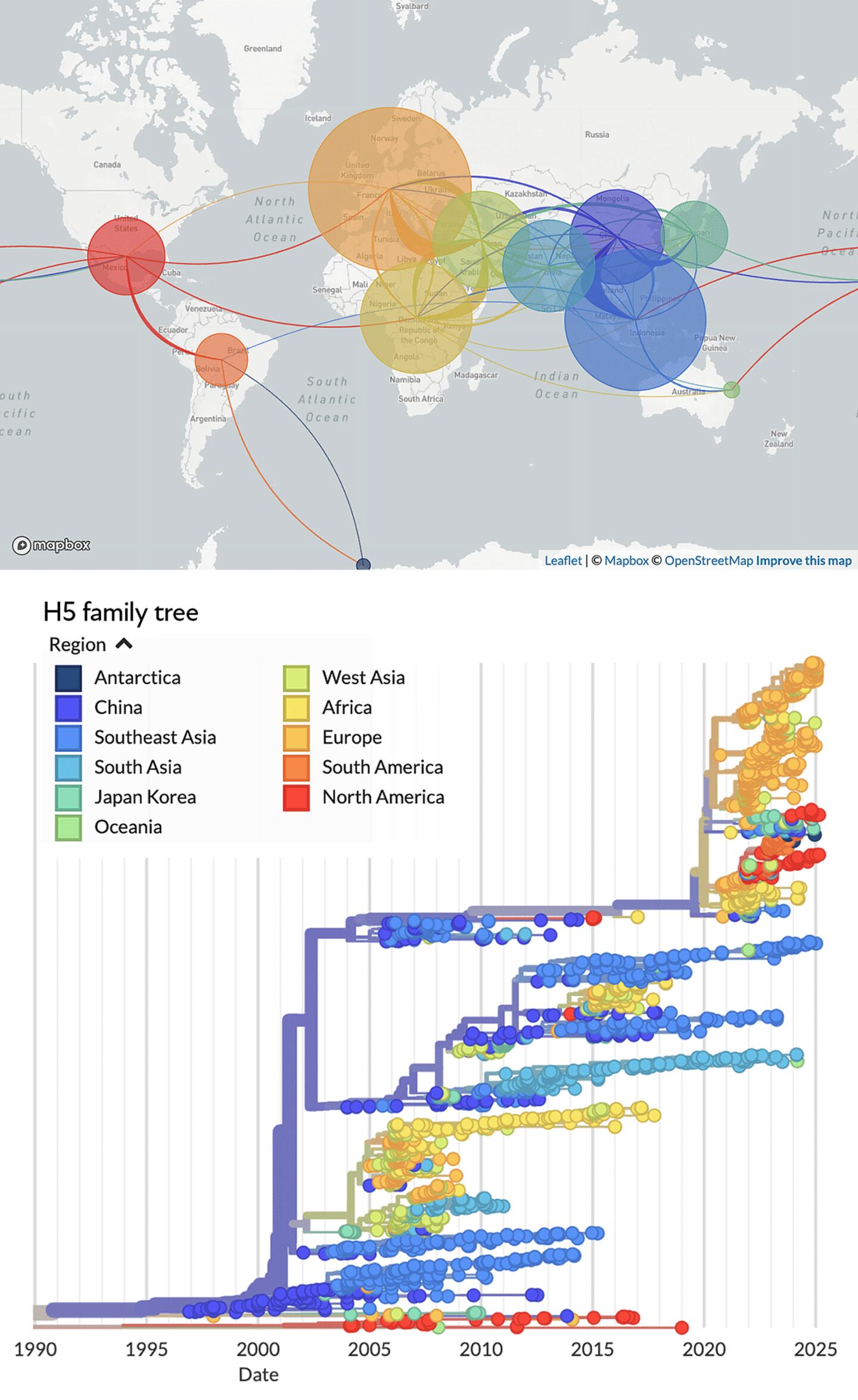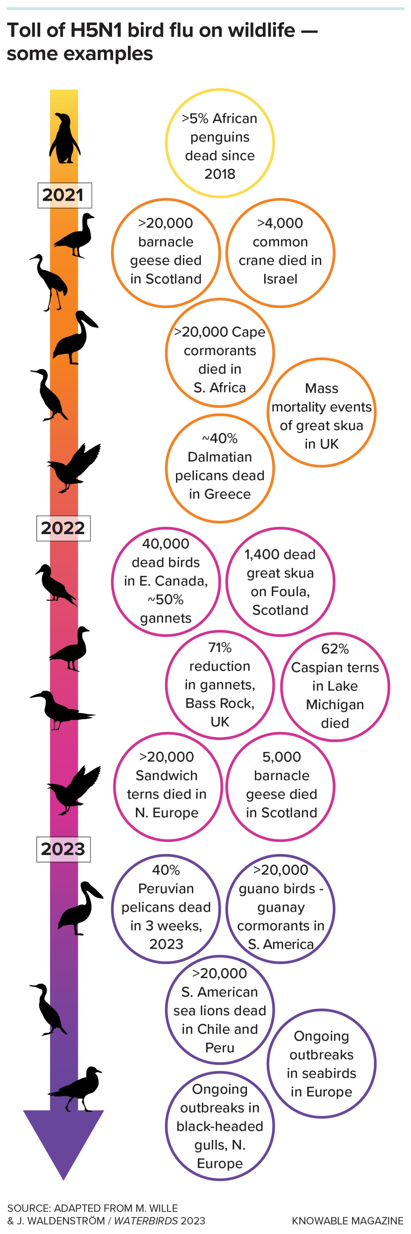 By late 2022, H5N1 had entered South America and was thundering down the continent's Pacific coast. "It then traveled the 6,000-kilometer spine of South America in six months, so that's very fast for a virus that's not assisted by planes," says Wille. It hit the tip of South America and jumped to Antarctica.