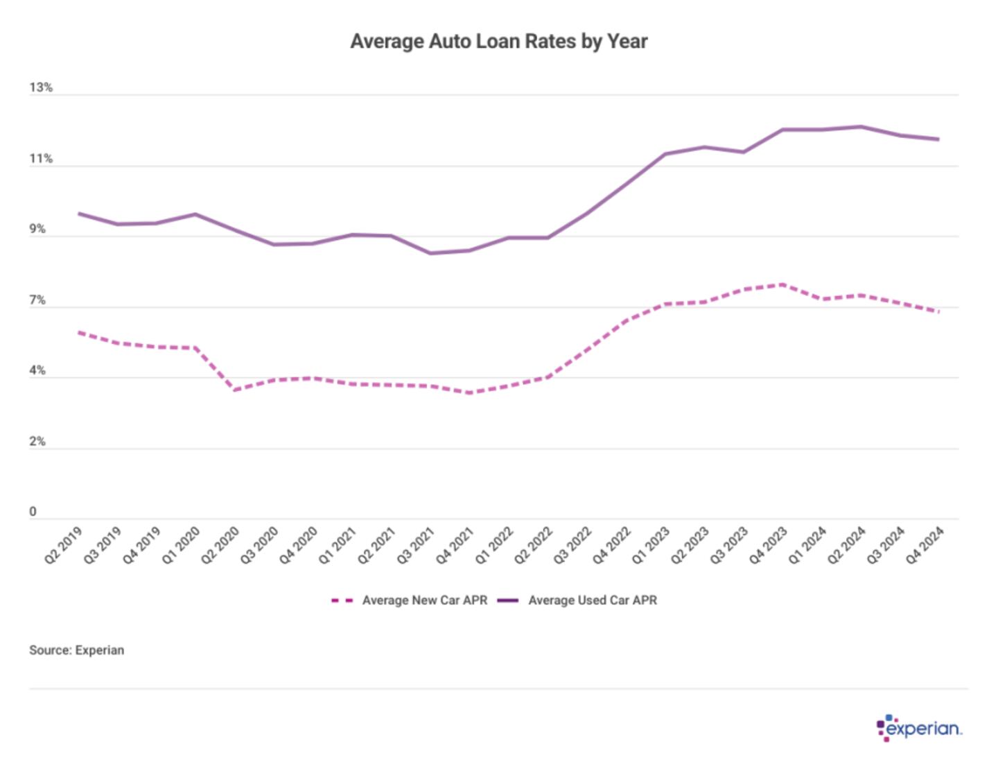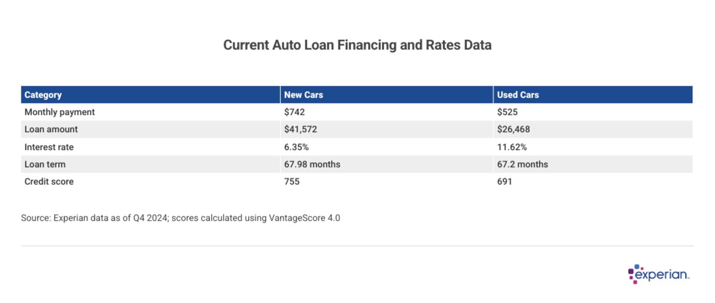 The average car loan interest rate is 6.35% for new cars and 11.62% for used cars, according to Experian's State of the Automotive Finance Market report from the fourth quarter (Q4) of 2024. If you're thinking about buying a car in the near future, understanding the auto financing market can help you better evaluate your options.