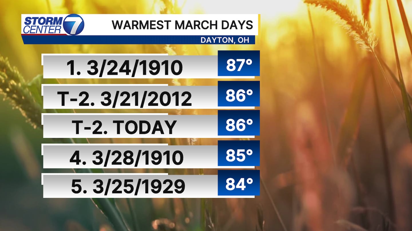 Where does this stand with all-time March warmth? According to the record books, today ties as the 2nd warmest day ever in March history. Records go back to 1895 for Dayton.