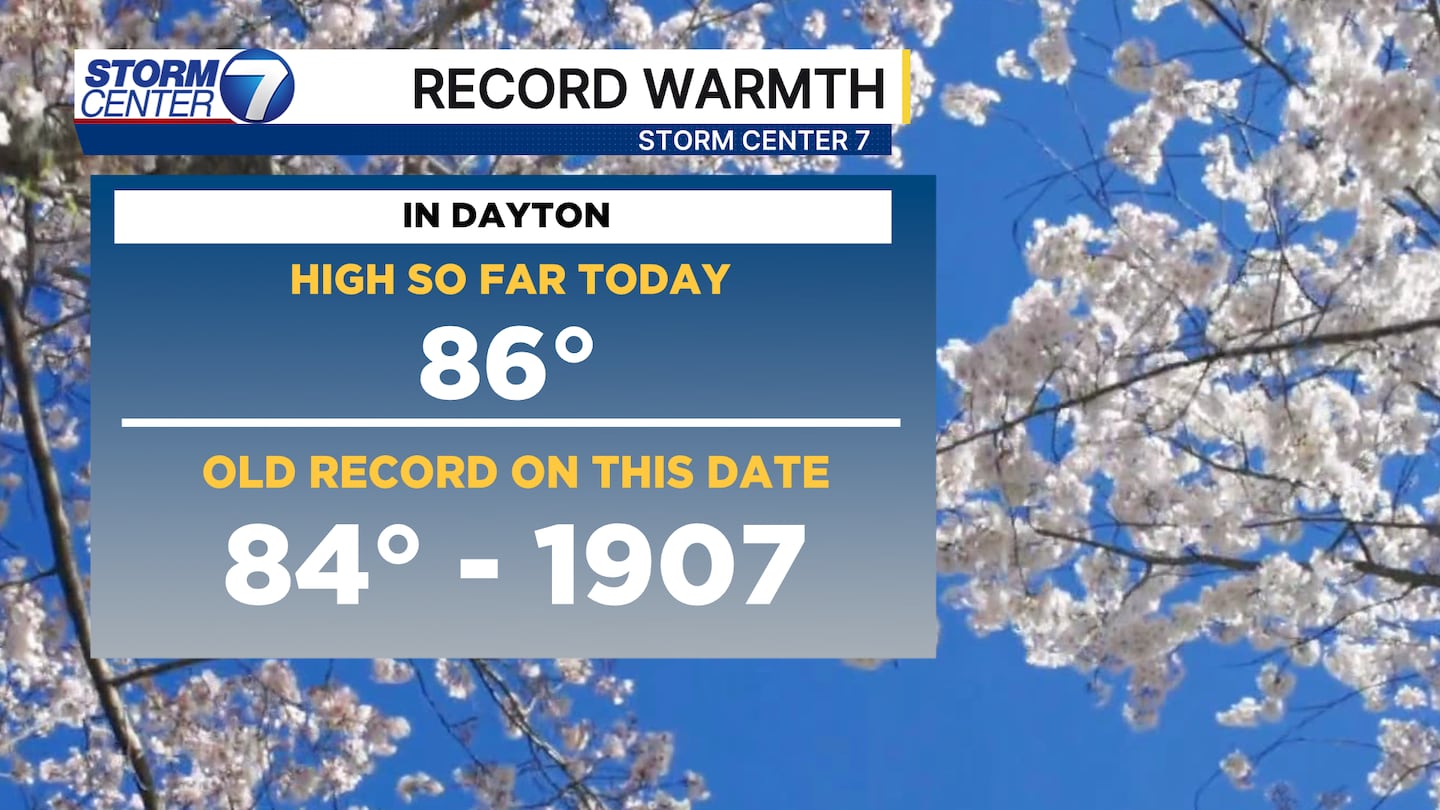 DAYTON — As of 2:00 PM this afternoon, according to the National Weather Service, Dayton broke the record high for March 22nd. The temperature hit 86 degrees, which breaks the old record on this date of 84 degrees back in 1907.
