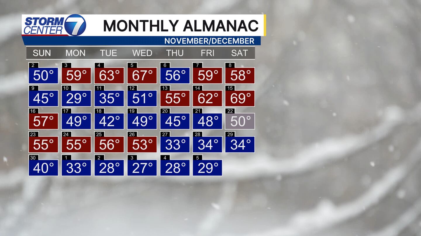 Check out this almanac from November 2 to December 5. There’s been lots of blue days, which means that high temperature was below average. So far we’ve made it 10 days including Saturday with highs below average.