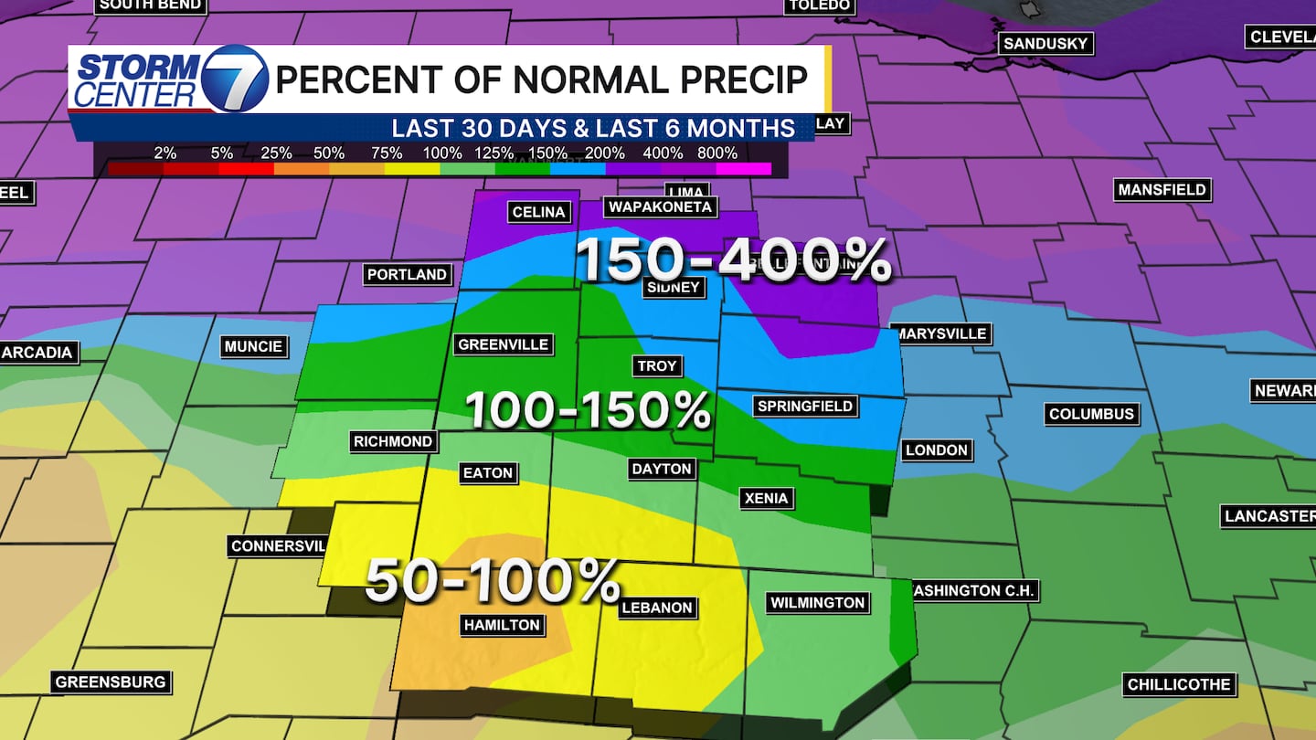 So, how did we get here in just one week? Let’s look back at the last 30 days. Below is a look at the percent of normal rainfall. This shows us how much rain has been received in a percentage form compared to normal. In the last 30 days, the northern Miami Valley has ran anywhere from 150 to 400 percent of normal.