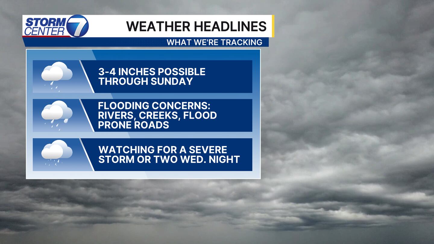 The flood watch is for areas along and south of I-70. Two to three inches of rain is possible. Please don’t drive through flooded roads if you encounter them.