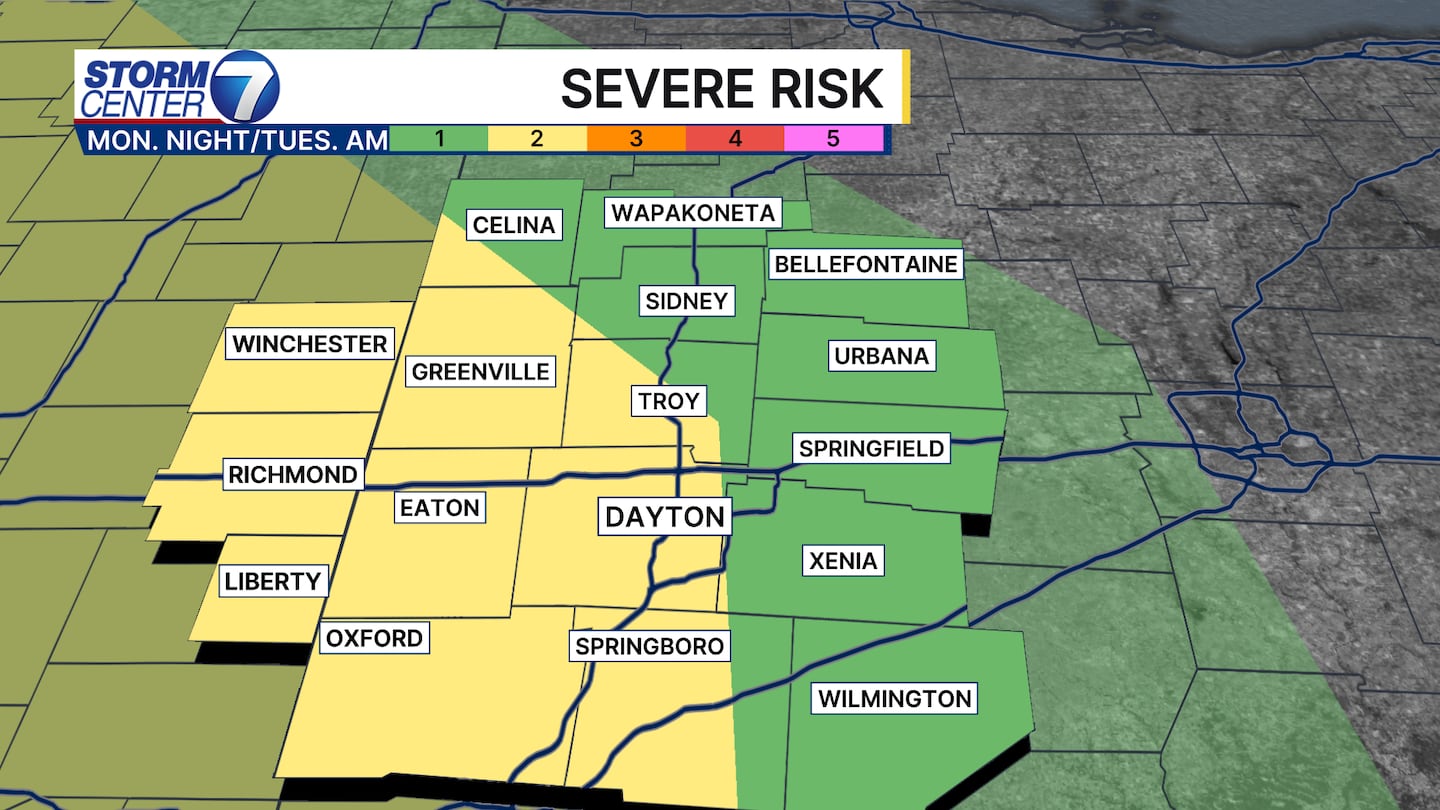 Firstly, our next system is moving to our area in under 72 hours. The Storm Prediction Center is giving areas west of I-75 a two out of five and areas east a one out of five. This means out of the storms we see overnight Monday into Tuesday a few of them could turn severe by producing damaging straight line winds.