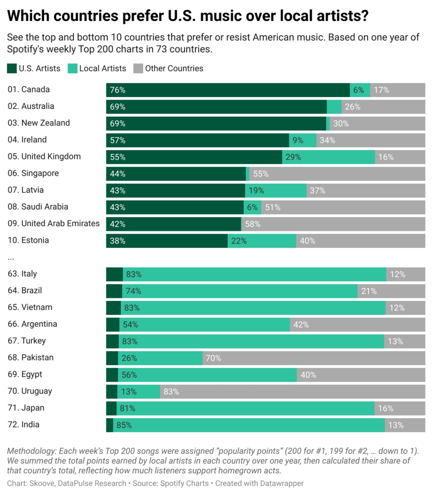 • American music conquers the Anglosphere: Canada allocates 76% of chart positions to U.S. music, while India resists at just 2%.