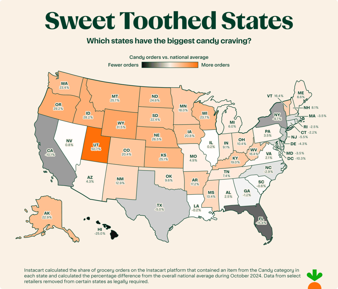 Who loads up on candy the most? Since Utah's first full year on the Instacart platform, Utah has once again decisively claimed the crown, buying candy 50% more often than the national average in October 2024. The Mountain West and Midwest dominated the leaderboard, with Wyoming, Oregon, Idaho, and Nebraska rounding out the top five. On the flip side, states like Hawai'i, Florida, and California purchased candy at rates well below the national average — proof that America's sweet tooth isn't evenly shared.