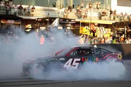 NASCAR Cup Series DuraMax Grand Prix Powered by RelaDyne AUSTIN, TEXAS - MARCH 01: Tyler Reddick, driver of the #45 Chumba Casino Toyota, celebrates with a burnout after winning his third race in a row to start the 2026 NASCAR season winning the NASCAR Cup Series DuraMax Grand Prix Powered by RelaDyne at Circuit of The Americas on March 01, 2026 in Austin, Texas. (Photo by Logan Riely/Getty Images) (Logan Riely/Getty Images)