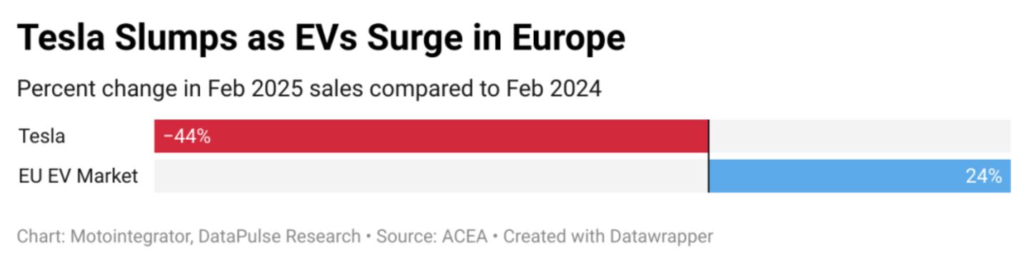 Tesla’s struggles are not limited to the U.S. The company’s European sales have dropped sharply in Q1 2025, despite surging EV demand. Competitors like Volkswagen, Renault, Ford, Citroën, and BYD more than doubled their registrations in February, leading to significant erosion of Tesla’s regional market share.
