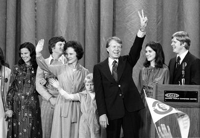Jimmy Carter and his family ATLANTA - NOVEMBER 1976: President Elect Jimmy Carter, governor and peanut farmer, gives victory speech with family and supporters on dais after election victory over ex-President Gerald Ford in Atlanta Georgia in November 1976.