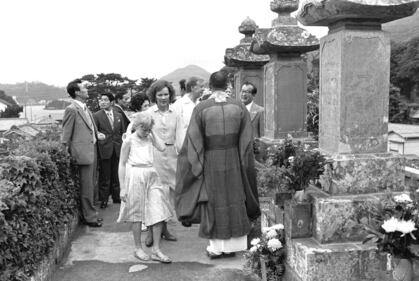 Jimmy Carter and his family President Jimmy Carter, first lady Rosalynn Carter and daughter Amy visit the graves of five sailors who were members of Commodore Perry's flagship, June 27, 1979. At left is Buddist priest Yodo Murakami, priest of the Gyokusenji Temple. (AP Photo) (Anonymous/ASSOCIATED PRESS)