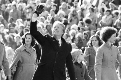Jimmy Carter and his family President Jimmy Carter waves to the crowd while walking with his wife, Rosalynn, and their daughter, Amy, along Pennsylvania Avenue from the Capitol to the White House following his inauguration in Washington, Jan. 20, 1977. (AP Photo/Suzanne Vlamis) (Suzanne Vlamis/AP)