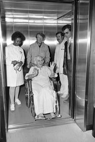 Jimmy Carter and his family Miss Lillian Carter in wheelchair, being assisted by her son, President-elect Jimmy Carter, waves to waiting newsmen in the lobby of the Sumpter County Hospital, Jan.1, 1977, Americus, Ga. She'd been confined there through the holidays and this was her first meeting with the press. The rest of the group is unidentified. (AP Photo) (Anonymous/AP)