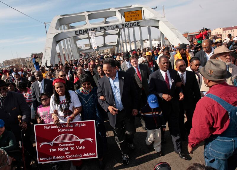 Photos: Jesse Jackson through the years 2010: The Rev. Jesse Jackson, center, leads a group of marchers across the Edmund Pettus Bridge in Selma, Ala., Sunday, March 7, 2010. (AP Photo/Dave Martin)