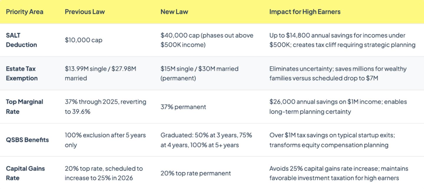 Beyond the cash savings that come from paying income taxes at a lower rate, this change is helpful to those trying to optimize their tax efficiency because it offers more certainty. High earners can now structure compensation, retirement distributions, and business decisions around a known tax environment rather than planning for rate increases.